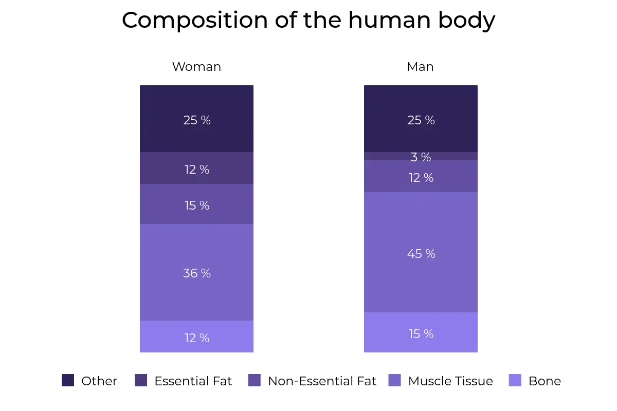 A comparative bar chart illustrating the typical body composition differences between women and men.